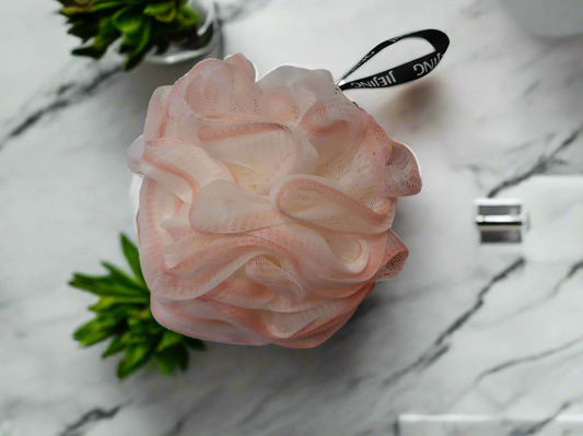 Luxurious Bath Sponge Pouf in Light Pink, Body Scrubber, Bathing Accessories, Nylon Pouf