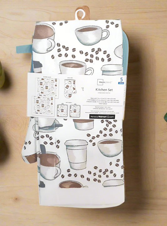 Mainstays 5-Piece Coffee Latte Images, Kitchen Towel, Oven Mitt & 2 Potholders Set