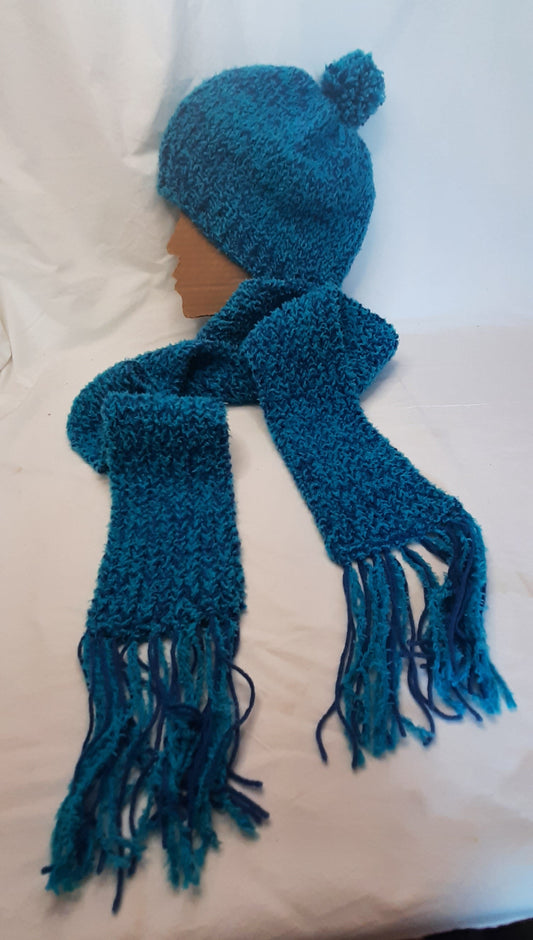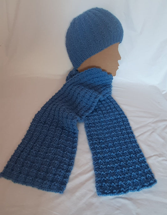 Handmade Knit Scarf and Hat set in Blue, Unisex Scarf and Hat Set
