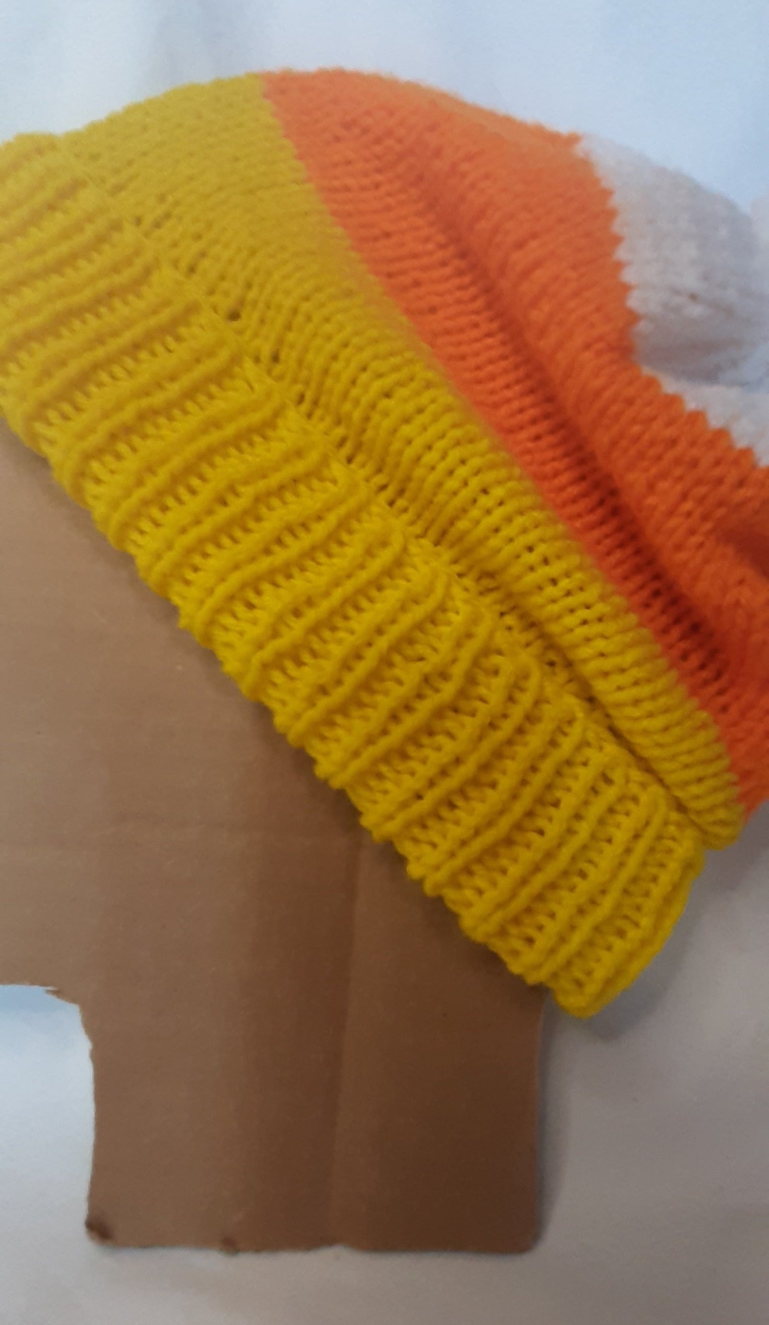 Candy Corn hat is so cute! Made to look like the candy corn we all know in yellow, orange and white. It has a large pompom at the end in white. If you want the three color pompom, just put it in the notes at check out! It has great slouch and is great for as an easy item to get into the Halloween spirit without dressing up :)