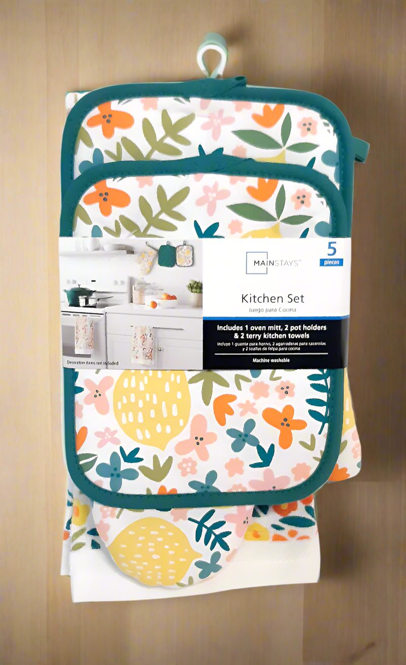 Mainstays 5-Piece Bright Lemons and Flowers Images, Kitchen Towel, Oven Mitt & 2 Potholders Set
