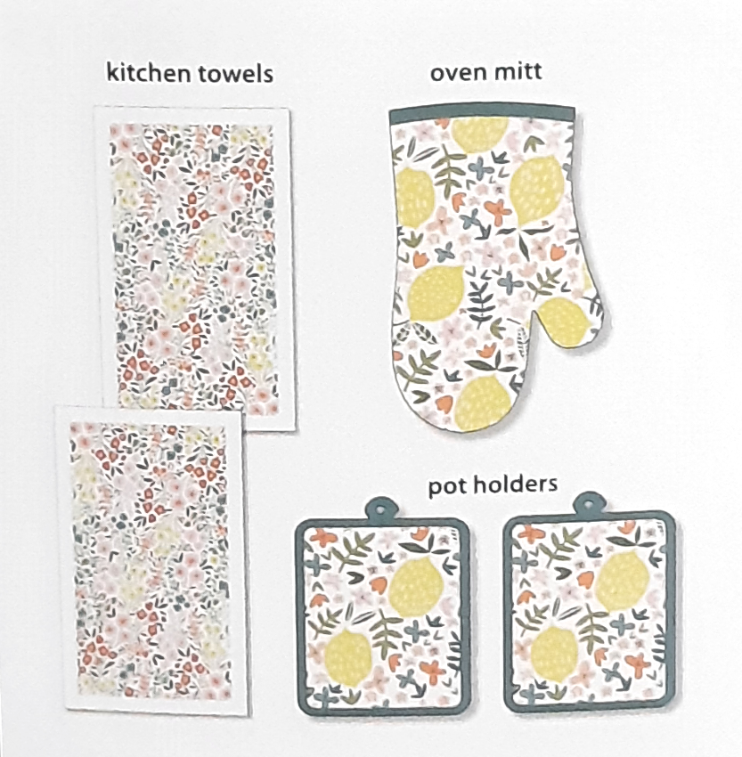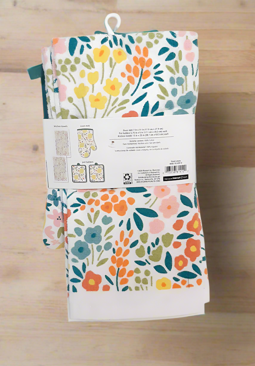 - The set includes two kitchen towels, one oven mitt, two pot holders.