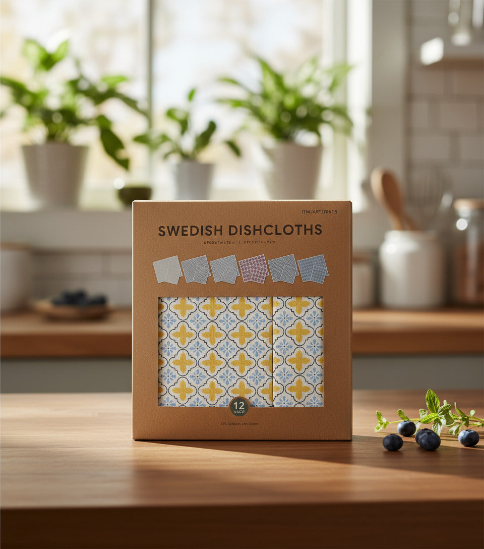 Absorbent and reusable kitchen dish cloths. These are so cool. They feel cardboard-y until you wet them and then they become a lovely dish towel! There are six designs in each box and they are just so pretty! All designs that come in the box shown in the photos.